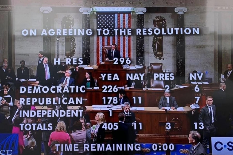 ՎԵՐԼՈՒԾԱԿԱՆԱՄՆ Ներկայացուցիչների պալատը երեկ ձայների ճնշող մեծամասնությամբ ընդունեց Հայոց ցեղասպանությունը ճանաչող թիվ 296 բանաձևը: 405 կոնգրեսական կողմ քվեարկեց բանաձևի ընդունմանը, դեմ էր 11-ը։