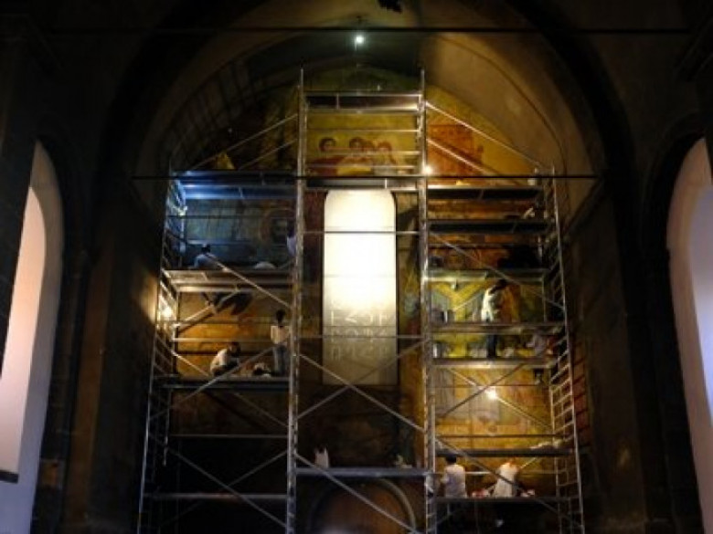 Վերականգնման աշխատանքներն իրականացնում է Որմնանկարների վերականգնման գիտահետազոտական կենտրոնը՝ Արժանիկ Հովհաննիսյանի ղեկավարությամբ: «Որմնանկարը հիմնականում վնասվել է ներթափանցած անձրևաջրերից, որոնք քայքայել են դրանց վերին շերտը։ Մենք առաջին փուլով կատարում ենք ներկի շերտի նախնական մաքրումներ, այնուհետև՝ դրա ամրակայում կանենք և հետո նորից կանդրադառնանք ներկի շերտի մաքրման աշխատանքներին»,-ասել է Արժանիկ Հովհաննիսյանը՝ կարևորելով որմնանկարի պահպանությունը, քանի որ դրանք եզակի են և արժեքավոր: