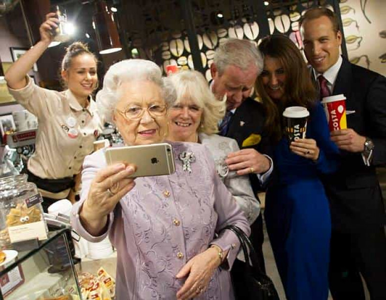 Բրիտանիայի թագուհու, Քեմբրիջի դքսի և դքսուհու, արքայազն Չարլզի և Կամիլայի նմանակները նկարահանվել են հանրահայտ լուսանկարչուհու կողմից իրենց սուրճը վայելելիս։
