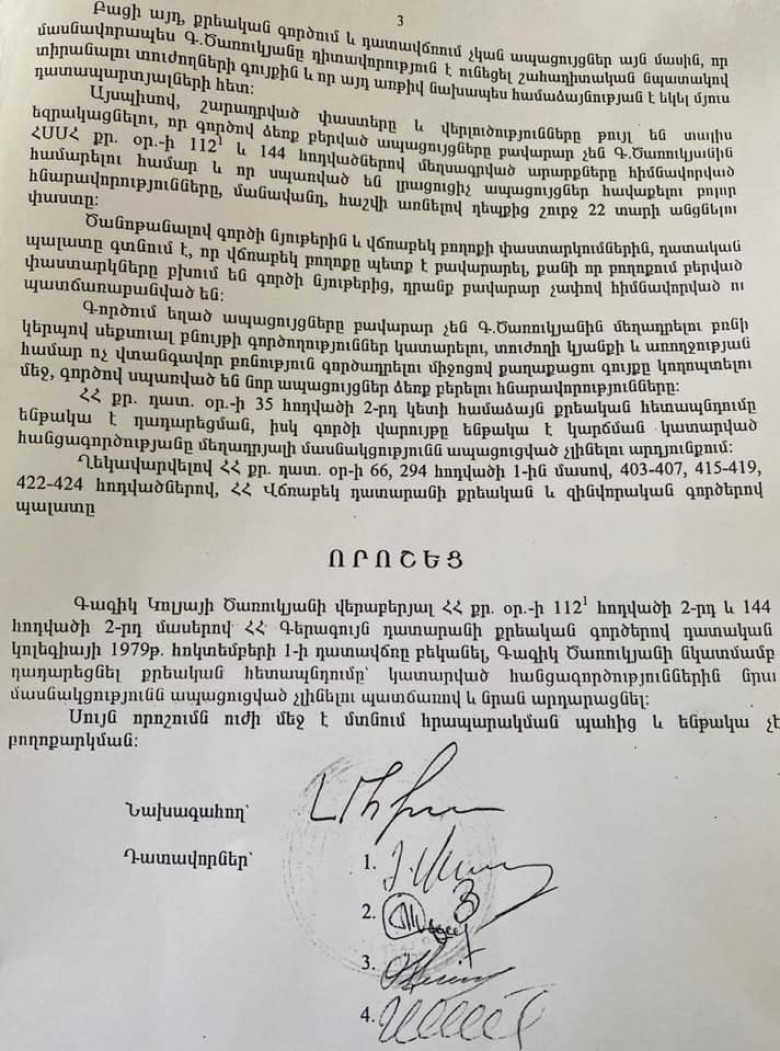 Ինչ վերաբերում է երեկ տարածած «անհայտ» օգտատիրոջ նյութին, ապա տարիներ առաջ եղել է վճռաբեկ դատարանի արդարացման վճիռը։ Փառք Աստծո՝ կան մարդիկ, ովքեր գիտեն ճշմարտությունը, որ այդ պատմության հիմքում ընկած է սովորական շանտաժի մի սովորական պատմություն։