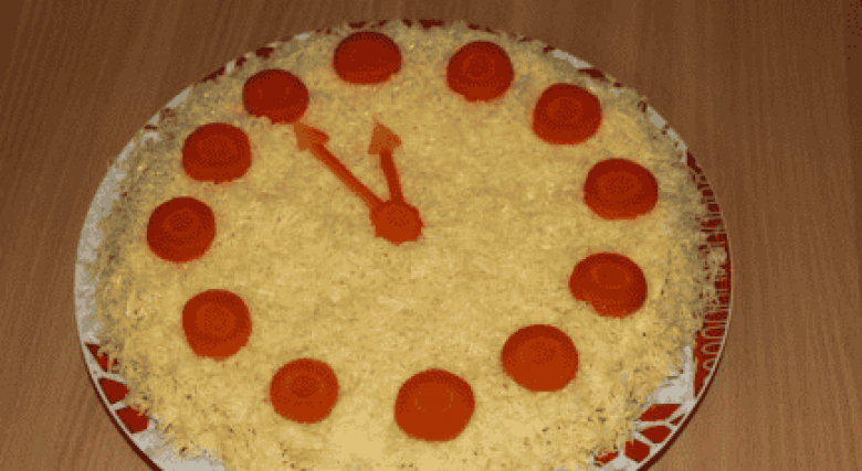 Ժամի տեսք տալ գազարի օգնությամբ։ Զարդարել կանաչիով ու մայոնեզով։