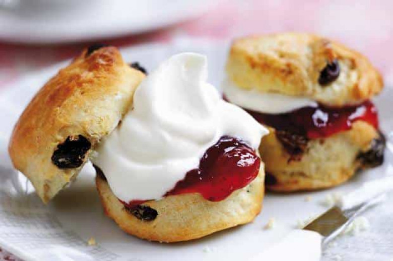 2 բաժակ ալյուր 1/3 բաժակ շաքարավազ 2 թեյի գդալ փխրեցուցիչ 1.8 թեյի գդալ աղ 1/3 բաժակ մարգարին 1/2 բաժակ թանձր սերուցք 1 ձու 1 թեյի գդալ վանիլին 1 բաժակ հավելումներ: Հավելումները կարող են լինել թարմ միրգ (ելակ, հատապտուղներ), սպիտակ շոկոլադի կտորներ, քաղցրավենիքի փոքր կտորներ (մասնավորապես toffee քաղցրավենիքի), սև շոկոլադ: