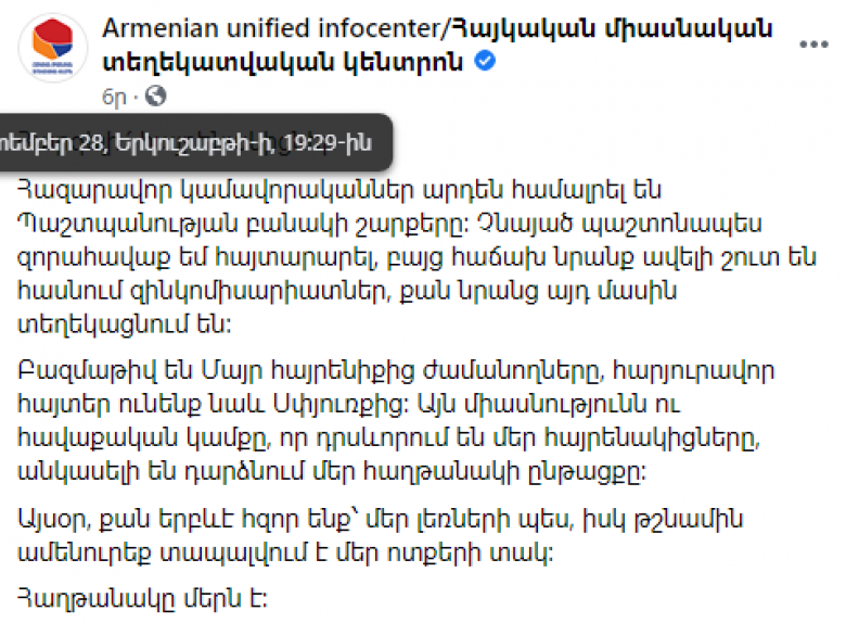 ՀԱՍԱՐԱԿՈՒԹՅՈՒՆՀայկական միասնական տեղեկատվական կենտրոնը հայտարարություն է տարածել, որտեղ մասնավորապես ասվում է
