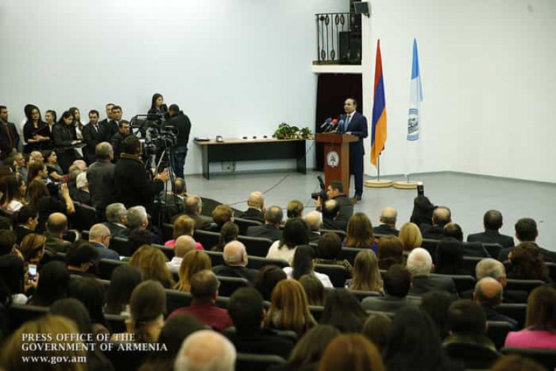 Պարգևատրման արարողությանը հաջորդել է կառավարության ղեկավարի ելույթը: Վարչապետը շնորհավորել է ԵՊԲՀ-ի պրոֆեսորադասախոսական անձնակազմին, ուսանողներին և բոլոր տարիների շրջանավարտներին` բուհի 95-ամյակի առթիվ, մաղթել նորանոր հաջողություններ և ձեռքբերումներ հետագա գործունեության ընթացքում: «1921 թ. նոյեմբերի 3-ին Երևանի քաղաքային հիվանդանոցին առընթեր բացվեց դպրոց, որը բժշկական կադրերի պատրաստման առաջին ուսումնական հաստատությունն էր: Այնուհետև այդ դպրոցի բազայի վրա հիմնվեց Երևանի պետական համալսարանի բժշկական ֆակուլտետը` հնարավորություն ընձեռելով հայ երիտասարդներին հայրենիքում ստանալու բարձրակարգ բժշկական կրթություն: Բժշկական ֆակուլտետի հիմնադրման և կայացման գործում իրենց նշանակալի ավանդն են ունեցել ինչպես ժամանակի պետական գործիչներ Ասքանազ Մռավյանը, Սեմյոն Լազարևը, այնպես էլ խորհրդահայ բժիշկների ավագ սերնդի մի շարք անվանի ներկայացուցիչներ», - նշել է Հովիկ Աբրահամյանը: