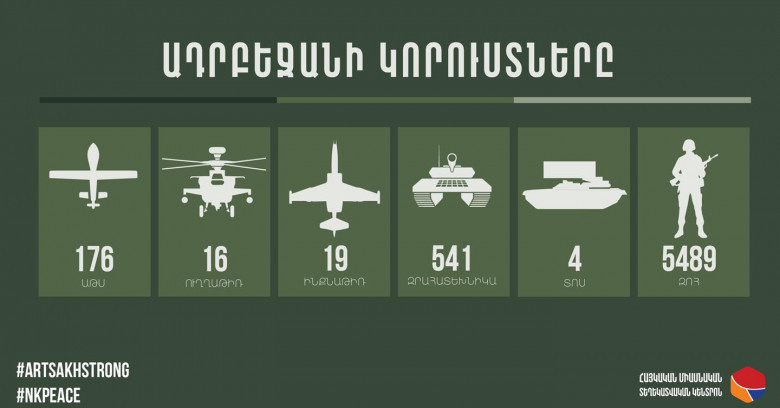 ՀԱՍԱՐԱԿՈՒԹՅՈՒՆՀակառակորդի կորուստների վերաբերյալ վերջին տվյալներով՝ խոցվել է ևս 3 ԱԹՍ, 20 զրահատեխնիկա, 1 ինքնաթիռ, կա 350 զոհ:
