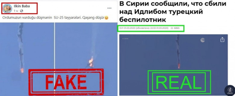 «Տեղեկատվության ստուգման կենտրոնը», ուսումնասիրելով լուսանկարները, հայտնում է, որ այն արվել է Սիրիայում՝ Սարակիբ քաղաքի մոտակայքում։ Պատկերվածն իրականում թուրքական ԱԹՍ է, իսկ լուսանկարն առաջին անգամ հրապարակվել է դեռևս 2020 թվականի մարտի 1-ին։
