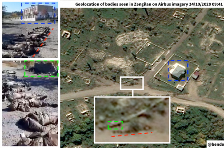 «Տեսանյութը, որում ցուցադրվում են դիերը, որոշները ձեռնաշղթաներով, մյուսներն էլ մերկը, արվել է Զանգելանում, Ղարաբաղ: Արբանյակից արված լուսանկարը (ամսաթիվը 24/10/2020) ցույց է տալիս այն հատվածը, որտեղ տեսանյութում ցուցադրվում են դիերը»,-իր թվիթերյան էջում գրել է Սթրիքը: