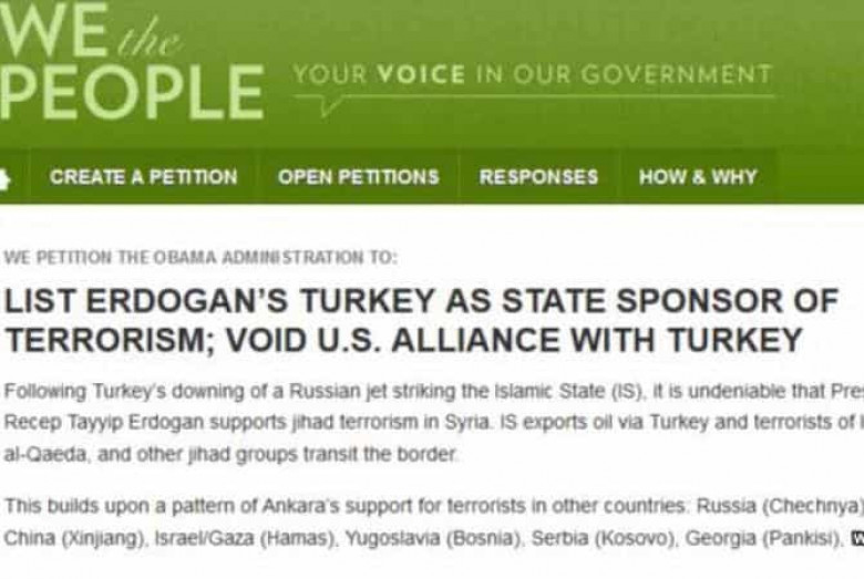 ՄԻՋԱԶԳԱՅԻՆՍպիտակ տան կայքում «Նախագահ Էրդողանի Թուրքիան պետք է հռչակվի ահաբեկչությանն աջակցող պետություն եւ պետք է վերջ դրվի ԱՄՆ-ի հետ այդ երկրի դաշնակցությանը» վերնագրով ստորագրահավաք է սկսվել: