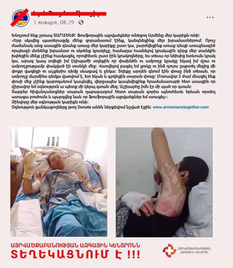 «Համացանցում ակտիվ տարածվում են մարտական գործողությունների ժամանակ վիրավորում ստացած զինծառայողների լուսանկարներ դրամահավաքության կոչերով, այդ թվում Այրվածքաբանության ազգային կենտրոնում այս պահին բուժում ստացող զինվորների։