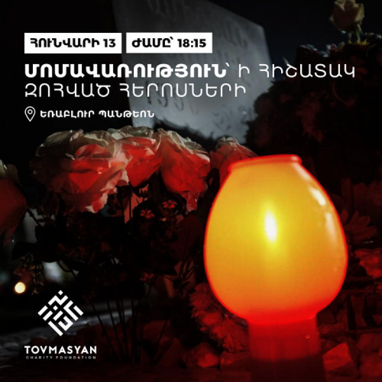 ՀԱՍԱՐԱԿՈՒԹՅՈՒՆՀունվարի 13-ին, ժամը 18:15-ին «Թովմասյան» բարեգործական հիմնադրամի նախաձեռնությամբ՝ «Եռաբլուր» զինվորական պանթեոնում տեղի կունենա մոմավառություն՝ ի հիշատակ Ադրբեջանի կողմից Արցախի նկատմամբ սանձազերծված պատերազմի հետևանքով առաջնագծում զոհված մեր հերոսների։