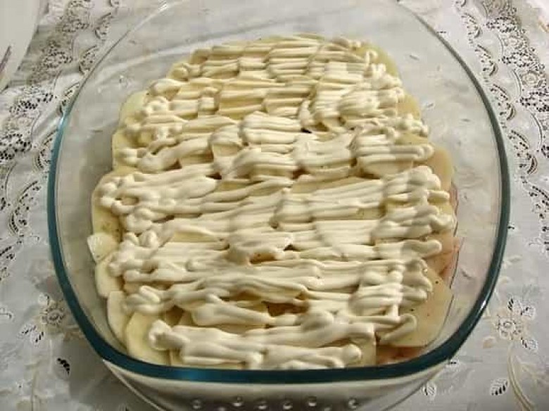 Հավի կրծքամիսը շատ բարակ՝ 1 սմ հաստությամբ կտրատել, աղով ու պղպեղով համեմել: Բարակ կտրատել նաև կարտոֆիլը՝ 2 մմ: Դասավորել ջեռոցում տեղադրվելիք տարրայի մեջ սկզբում հավի միսը, ապա կարտոֆիլը: Այնուհետ մայոնեզով պատել, ավելացնել պանիրն ու դնել ջեռոցում: Ծածկել փայլաթիթեղով ու եփել 180-200 С, մոտ 1 ժամ: 1 Ժամ անց հանել փայլաթիթեղը, որպեզի կարմրի: