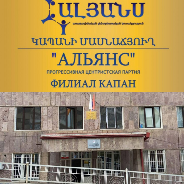 ՀԱՍԱՐԱԿՈՒԹՅՈՒՆԿապան քաղաքում Լեռնագործների 5ա հասցեով բացվեց Ալյանս կուսակցության տարածքային կառույցի գրասենյակը։ Սա Ալյանսի տասներկուերորդ գրասենյակն է, որը համակարգելու է քաղաքի և մերձակա բնակավայրերի կուսակցական ակտիվի և համակիրների գործունեությունը։ Ալյանսում անդամագրությունն իրականացվում է նաև օնլայն www.alyans.am կայքում, որից հետո մարզերի բնակիչների տվյալները փոխանցվում են տարածքային կառույցներին։