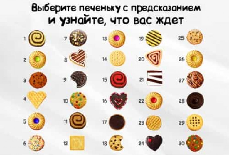 ԼԱՅՖԱռաջարկում ենք մի հասարակ գուշակություն այն մասին, թե ինչ է ձեզ սպասվում ապագայում: Բացեք նկարը, փակեք աչքերը ու շարժեք կուրսորը: Ո՞ր թխվածքաբլիթն եք ընտրել: Իմացեք դրա նշանակությունը: