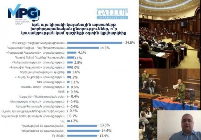 Հարցվածների 74 % -ը մտադիր է մասնակցել ընտրություններին: Իսկ հարցվածների 41 % -ը կա՛մ չի քվեարկի, կա՛մ դեռ կոնկրետ չի որոշել, թե ում օգտին է քվեարկելու: Ներկայիս քաղաքական ուժերից խորհրդարան անցնելու ամենամեծ շանսերն ունեն Նիկոլ Փաշինյանի «Իմ քայլը» (գրեթե 25 % աջակցություն) և նախկին նախագահ Ռոբերտ Քոչարյանի «Հայաստան» դաշինքը (14%): Հարցումներն անցկացվել են ապրիլի վերջին: Այնպես որ, ներկայումս իրավիճակը, հավանաբար, փոխվել է: Կարելի է ենթադրել, որ նաև Սյունիքի ռազմական ճգնաժամի ֆոնին Փաշինյանի ժողովրդականությունը նվազել է, մինչդեռ Քոչարյանի գլխավորած ազգայնականների ժողովրդականությունն աճել է:
