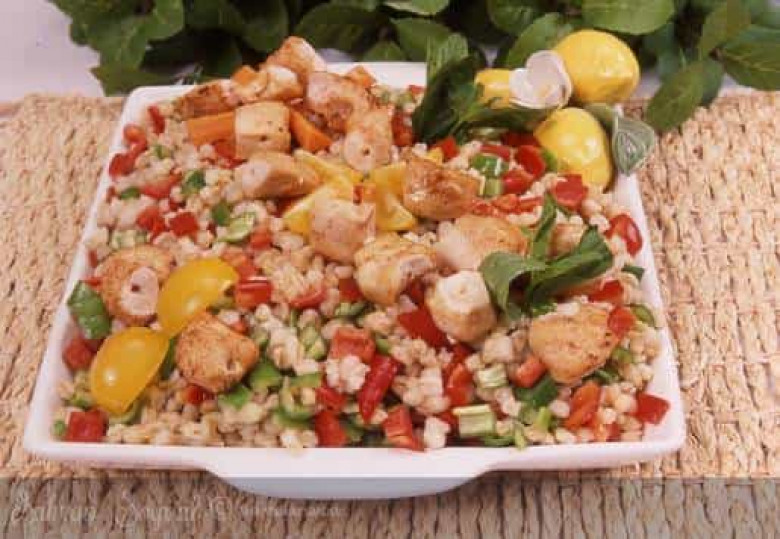 ԼԱՅՖ2 հավի բուդը ոսկրահան անել, միսը բաժանել մանր կտորների, տապակել ձեթով: 1 բաժակ խաշած ձավարին ավելացնել մանր կտրտած 2 կանաչ և 2 կարմիր բիբար, մանր կտրտած 1 պոմիդոր, տապակած հավի միսը, 6 ճաշի գդալ ձեթ, 1 կիտրոնի հյութը, կես թեյի գդալ մանանեխ, աղ, սև բիբար, խառնել: Լցնել սալաթամանը, զարդարել: