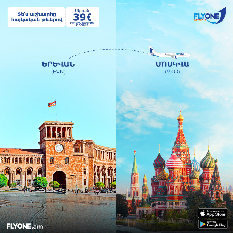 ՀԱՍԱՐԱԿՈՒԹՅՈՒՆՀայաստանի և Ռուսաստանի Դաշնության ավիացիոն իշխանությունների թուլտվությամբ` FLYONE ARMENIA ավիաընկերությունը սույն թվականի մարտի 1-ից սկսում է Երևան - Մոսկվա - Երևան երթուղով կանոնավոր ուղիղ չվերթները: