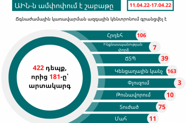 ՀԱՍԱՐԱԿՈՒԹՅՈՒՆԱպրիլի 11-ից 17-ն ԱԻՆ ՓԾ ճգնաժամային կառավարման ազգային կենտրոնում գրանցվել է 422 դեպք, որից 181-ը արտակարգ, այդ թվում՝ 106 հրդեհի, 3 փլուզման, 7 ինքնասպանության փորձի դեպք, 39 ճանապարհատրանսպորտային պատահար, ինչպես նաև՝ 163 կենցաղային կանչ. տուժել է 75 մարդ։