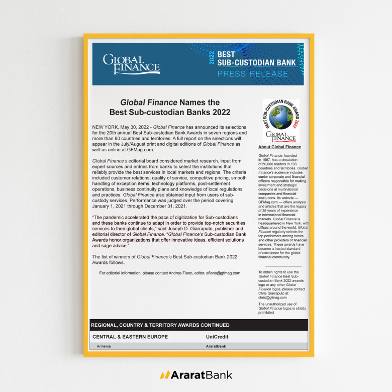 ՀԱՍԱՐԱԿՈՒԹՅՈՒՆԱրարատԲանկը երկրորդ տարին անընդմեջ «Global Finance» միջազգային հեղինակավոր ամսագրի մասնագիտական թիմի կողմից ճանաչվում է Հայաստանի «Լավագույն ենթապահառու բանկ»: