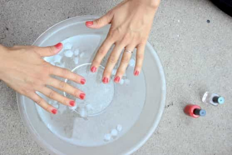 Մինչ կսկսեք քսել եղունգների լաքը՝ տարայի մեջ լցրեք սառը ջուր և մի քանի սառցե խորանարդ։