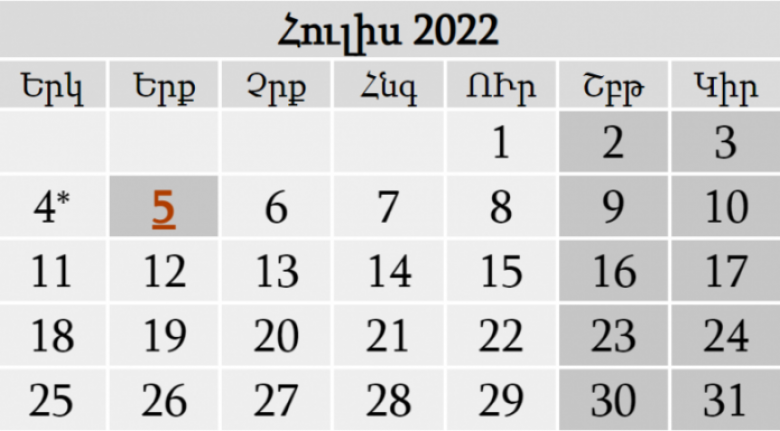 Հուլիսին կլինի 11 ոչ աշխատանքային օր