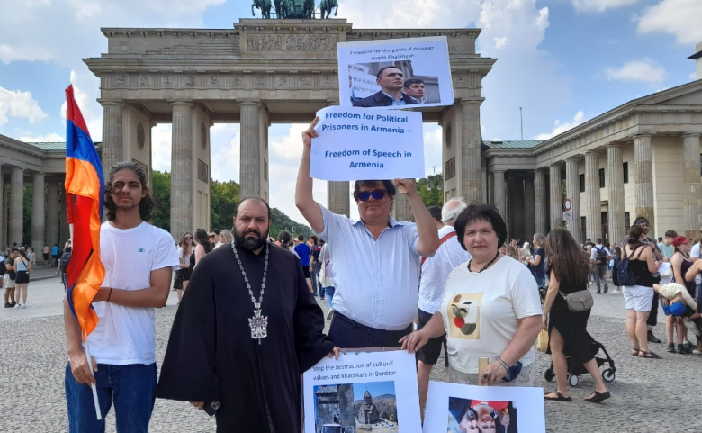 ՎԵՐԼՈՒԾԱԿԱՆԲեռլինում օրերս ուշագրավ բողոքի ակցիա է տեղի ունեցել Բրանդենբուրգյան դարպասների մոտ։ Հայ համայնքի մի խումբ ներկայացուցիչներ պաստառներով ակցիա են արել ընդդեմ Բերձորի և Աղավնոյի էթնիկ զտումների, նաև ի պաշտպանություն Հայաստանի քաղբանտարկյալների։ Նրանք կոչ են արել դադարեցնել էթնիկ զտումները Բերձորում և Աղավնոյում, դադարեցնել մշակութային արժեքների և խաչքարերի ոչնչացումը, նաև արգելափակել Իլհամ Ալիևի և Նիկոլ Փաշինյանի անձնական հաշիվները Եվրոպական միությունում։