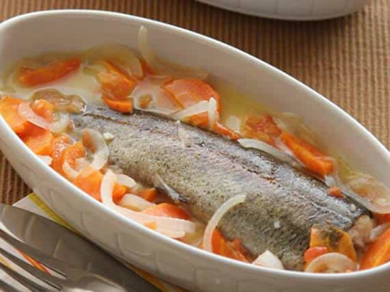 Ձուկը դնում ենք մի քիչ խոր ամանի մեջ, բանջարեղենը կողքից շարում և վրան լցնում սոուսը(արգանակը)։