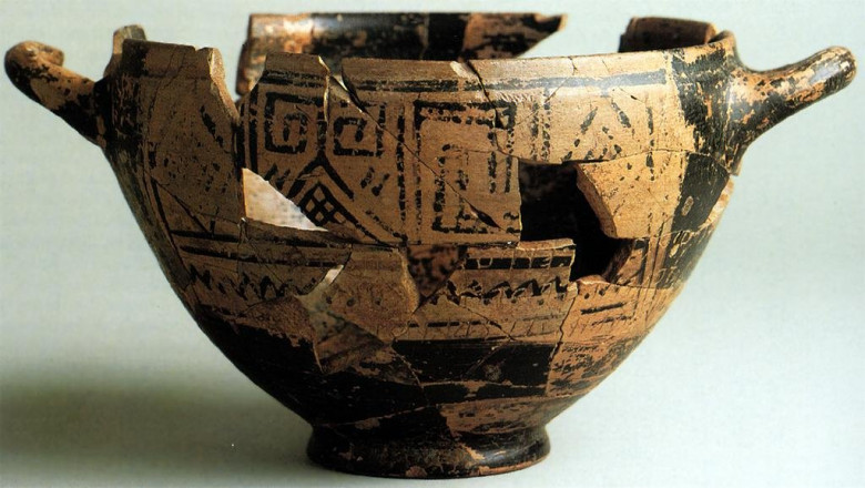 Իսկիայում (այս կղզում հին հունական գաղթօջախների պատմության մեջ առաջին գաղութներից մեկն էր) գտնված թասը կավե անոթ է (կոտիլա), որի արտադրությունը թվագրվում է մոտ մ.թ.ա. 750-700 թվականներով: Ենթադրվում է, որ այդ թասը պատրաստվել է Հռոդոս կղզում: Ներկայում այն պահվում է Իշիա կղզու Լակկո Ամենո գյուղի Villa Arbusto թանգարանում։ Իսկիայի թասի կողքերից մեկում առկա է գրություն, որը հին հունական այբուբենով գրված ամենահին արձանագրություններից մեկն է: Այդ գրառումը սովորաբար վերծանվում է այսպես.