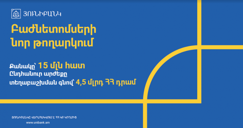 ՏՆՏԵՍՈՒԹՅՈՒՆ«Յունիբանկ» ԲԲԸ-ն իրականացնում է բաժնետոմսերի նոր թողարկում: Հրապարակային առաջարկի արդյունքում բանկը նախատեսում է տեղաբաշխել 15 մլն ոչ փաստաթղթային սովորական բաժնետոմս, որոնց ընդհանուր արժեքը տեղաբաշխման գնով կազմում է 4.5 մլրդ ՀՀ դրամ: