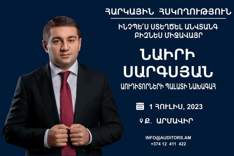 «Աուդիտորների Պալատ»-ի նախագահ Նաիրի Սարգսյանի «ՀԱՐԿԱՅԻՆ ՀՍԿՈՂՈՒԹՅՈՒՆ» թեմայով հերթական դասախոսությունը տեղի կունենա հուլիսի 1-ին ք.Արմավիրում