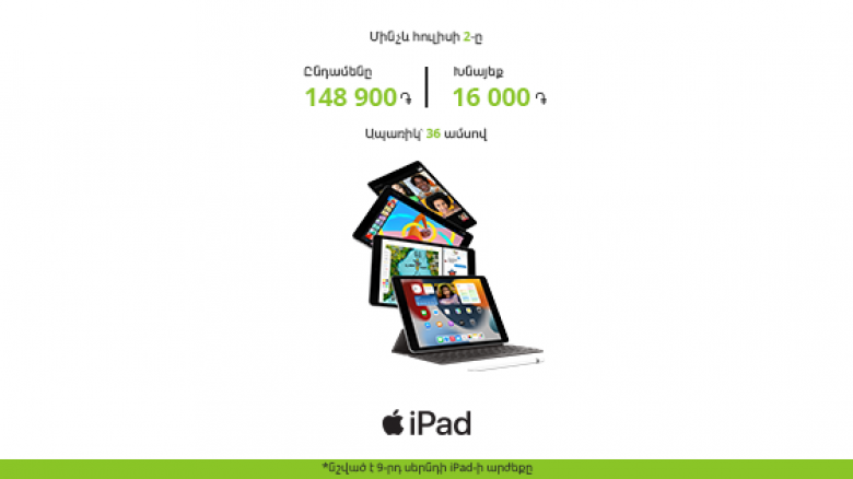 ՀԱՍԱՐԱԿՈՒԹՅՈՒՆՄինչև հուլիսի 2-ը «Յուքոմ» ընկերության վաճառքի և սպասարկման կենտրոններում, ինչպես նաև Ucom-ի առցանց խանութում հնարավոր է ձեռք բերել 9-րդ սերնդի 64 ԳԲ ծավալով և Wi-Fi կապի հնարավորությամբ iPad 10.2 մոդելն ընդամենը 148 900 դրամով։