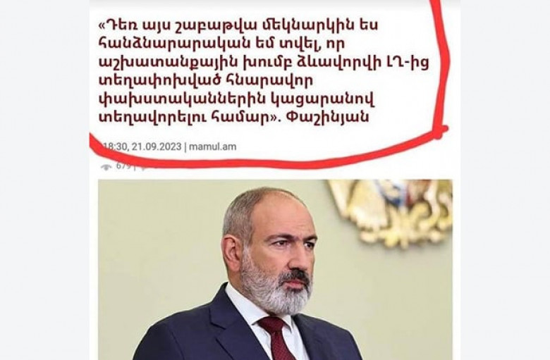 Բա սա ի՞նչ է նշանակում: Սա էլ ե՞ք հերքելու: Նիկոլը փաստացի խոստովանել է, որ տեղյակ է եղել Արցախի դեմ ագրեսիայի մասին, և որպես դրա հնարավոր հետևանք` Արցախից փախստականների հարցերով զբաղվելու հանձնարարականներ է տվել:
