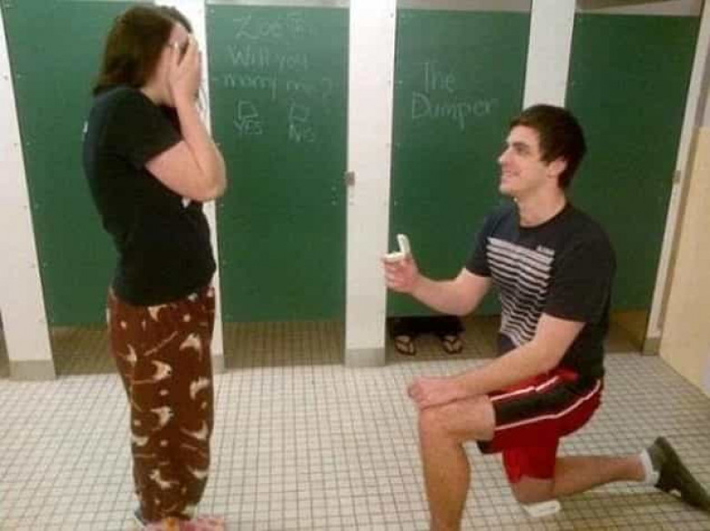 Հանրային զուգարանում առաջարկություն անող երիտասարդը «հարցաթերթիկ» է նկարել խցիկներից մեկի դռանը, որտեղ «այո» կամ «ոչ»-ի ընտրության հնարավորություն կա «Կամուսնանա՞ս ինձ հետ» հարցին։