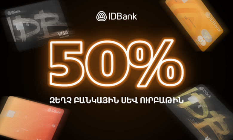 ՀԱՍԱՐԱԿՈՒԹՅՈՒՆՍև ուրբաթին ընդառաջ՝ նոյեմբերի 10-ից դեկտեմբերի 1-ը ներառյալ, պատվիրե՛ք IDBank-ի Visa Gold, Travel, Visa Platinum, Mastercard Standard քարտերը և ստացե՛ք 50% զեղչ քարտերի գործողության ողջ ժամանակահատվածի համար։