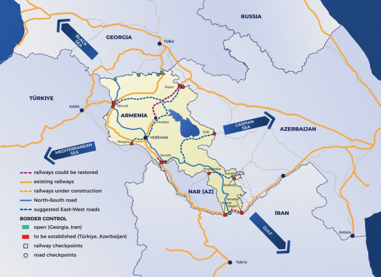 Նույնիսկ խոսվում էր այն մասին, որ ճանապարհների ապաշրջափակման արդյունքում Հայաստանի ՀՆԱ-ն կարճ ժամանակամիջոցում 30 %-ի աճ կարձանագրի։ Ու ճանապարհների բացման ծրագրին ինստիտուցիոնալ տեսք հաղորդելու համար Փաշինյանը ներկայացրեց նոր նախագծի իրականացման գաղափարը, որը միախառնվեց «Հյուսիս-Հարավ» նախագծին և ստացավ «Հյուսիս-Հարավ/Արևելք-Արևմուտք», կամ՝ «Հայկական խաչմերուկ» անվանումը։ Փաշինյանն իր ելույթներում ներկայացնում էր, որ «Հայկական խաչմերուկը» նոր հորիզոններ է բացում ոչ միան Թուրքիայի ու Ադրբեջանի հետ հաղորդակցություն հաստատելու, այլև Ռուսաստանի ու Իրանի հետ երկաթուղային հաղորդակցության վերականգնման համար։ Բայց պետք է նկատի ունենալ, որ խաչմերուկի նախագիծը նշանակում է խաչվող ճանապարհներ, իսկ դրանում Վրաստանի ու Իրանի հետ մեր ուղիղ հաղորդակցության բարելավման մասին խոսք չկա, այնինչ Հայաստանը սահման ունի այդ երկրների հետ։