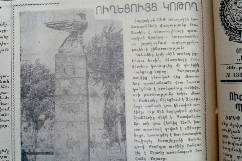 «Սովետական Հայաստան» պարբերականի 1956 թվականի համարներից մեկում կարդում ենք. «Հայկական ՍՍՌ Խճուղային ճանապարհների վարչությունը ձեռնարկել է ռեսպուբլիկայի պատմական նշանավոր հուշարձանների շրջակայքում ուղեցույց-կոթողների շինարարություն: Երեւանից Էջմիածին տանող խճուղու եզրին՝ Զվարթնոցի մոտ, վերջերս կառուցվեց մի գեղեցիկ ուղեցույց-կոթող: