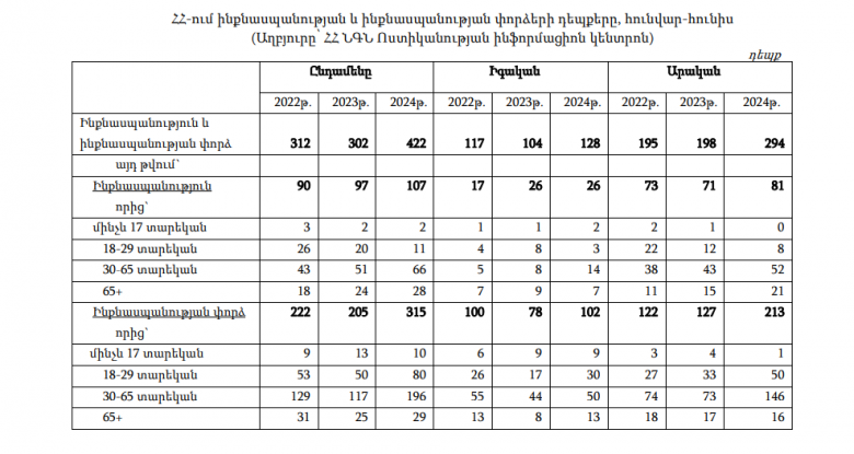 ՀԱՍԱՐԱԿՈՒԹՅՈՒՆ2024 թվականի առաջին 6 ամիսների ընթացքում ՀՀ-ում ինքնասպանության և ինքնասպանության փորձի 422 դեպք է գրանցվել։ Այս մասին Iravaban.net-ը տեղեկանում է Վիճակագրական կոմիտեից։