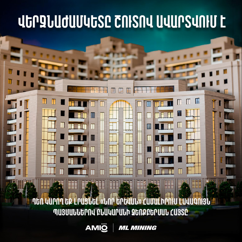 ՀԱՍԱՐԱԿՈՒԹՅՈՒՆ25․07․2024-ին մեկնարկել է Ամիօ Բանկի և ՄԼ Մայնինգ ընկերության համատեղ նախագիծը, որի շրջանակներում մի շարք շահառու խմբեր և Ամիօ Բանկի ֆիզիկական հաճախորդները կարող են 300 բնակարան ձեռք բերել լավագույն պայմաններով (1քմ-ն` 389 հազար դրամ)։