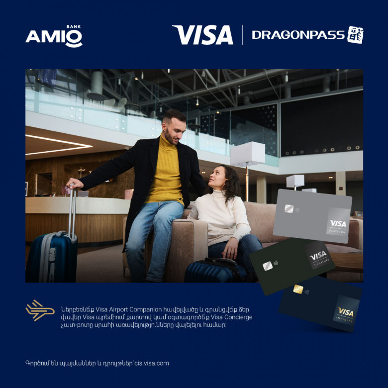 ՀԱՍԱՐԱԿՈՒԹՅՈՒՆՃամփորդություններն առավել հարմարավետ դարձնելու համար Visa-ն գործարկել է Visa Airport Companion հավելվածը, որտեղ կարող ես կցել AMIO Visa Platinum, Visa Infinite կամ Visa Business Signature քարտդ ու օգտվել օդանավակայանների բիզնեսի սրահների մուտքի առավելություններից։
