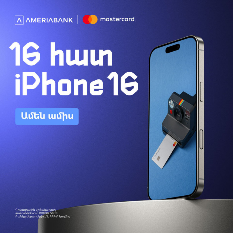 Պատվիրելով նոր Mastercard Ամերիաբանկից և ակտիվացնելով այն` հաճախորդները նաև կմասնակցեն 48 հատ iPhone 16-երի խաղարկությանը․ արշավի շրջանակում մինչև տարեվերջ յուրաքանչյուր ամիս` հոկտեմբերին, նոյեմբերին, դեկտեմբերին, խաղարկվելու է 16-ական iPhone 16: