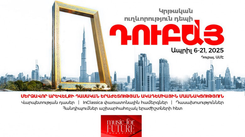 ՄՇԱԿՈՒՅԹՄերձավոր Արևելքի դասական երաժշտության ակադեմիան «Երաժշտություն հանուն ապագայի» հիմնադրամի հետ միասին առաջարկում են ճանապարհորդության բացառիկ հնարավորություն: Հիմնադրամն արդեն երրորդ անգամ նախաձեռնում է «Կրթական ուղևորություն» դեպի Արաբական Միացյալ Էմիրություններ, մասնավորաբար՝ Դուբայ քաղաք՝ Մերձավոր Արևելքի դասական երաժշտության ակադեմիային (Middle East Classical Music Academy-MECMA) մասնակցելու նպատակով: Այն անցկացվելու է 2025 թ․-ի ապրիլի 6-ից 21-ը։ Հիմնադրամն Ակադեմիայի կազմակերպիչներից ստացել է բացառիկ առաջարկ Հայաստանի երաժշտական կրթօջախների սաների և ուսուցիչների համար: