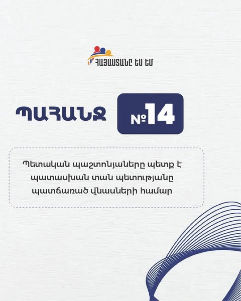 Պետական պաշտոնյաները պետք է պատասխան տան պետությանը պատճառած վնասների համար. «Հայաստանը ես եմ»-ի 14-րդ պահանջը
