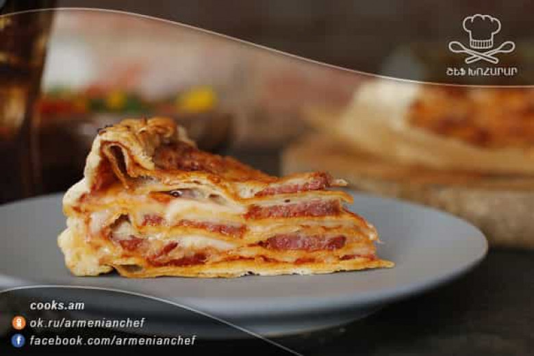 - Վրան 1-1,5 ճ/գդ լոլիկի մածուկ ենք քսում։ Այնուհետև սալյամի ենք դնում և վրան պանիր շաղ տալիս։ Այդպես հերթով բոլոր շերտերը շարում ենք` մինչև ձևամանը լցվի։ Վերջին շերտը նույնպես պատում ենք լոլիկի մածուկով, սալյամի շարում, և վրան քերած պանիր լցնում։
