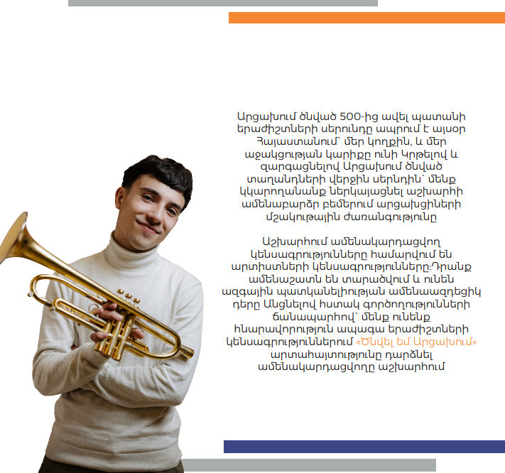 ՄՇԱԿՈՒՅԹՄեր նախորդ հրապարակումներում ընթերցողներին պատմել ենք «Ծնվել եմ Արցախում» կրթական ծրագրի մասին, որն իրականացվում է Հայաստանի պետական սիմֆոնիկ նվագախմբի գեղարվեստական ղեկավար և գլխավոր դիրիժոր, UNICEF-ի ազգային դեսպան Սերգեյ Սմբատյանի նախաձեռնությամբ և նախատեսված է Արցախից տեղահանված տաղանդավոր երիտասարդ երաժիշտների համար: Այս նախաձեռնության նպատակն է արցախցի երաժիշտներին ներգրավվել դասական երաժշտության ասպարեզ, ցույց տալ, որ բազմաթիվ փորձություններից հետո նրանք այսօր միայնակ չեն իրենց հայրենիքում, և դասական ակադեմիական գործիքներ նվագող երիտասարդ երաժիշտները կարող են արժանապատիվ ճանապարհ հարթել արվեստի ոլորտում՝ իրենց տաղանդի ու աշխատասիրության շնորհիվ: