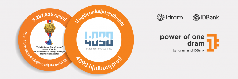 Նախորդ ամսվա ընթացքում «Մի դրամի ուժի» հավաքագրած 5․237․825 ՀՀ դրամն ուղղվեց «Հերոսների վերականգնողական քաղաք» հոգեկան առողջության կենտրոնին, որի նպատակն է ապահովել պատերազմի մասնակից անձանց և նրանց ընտանիքների անդամների հոգեկան և սոցիալական վերականգնումն ու բարելավումը։