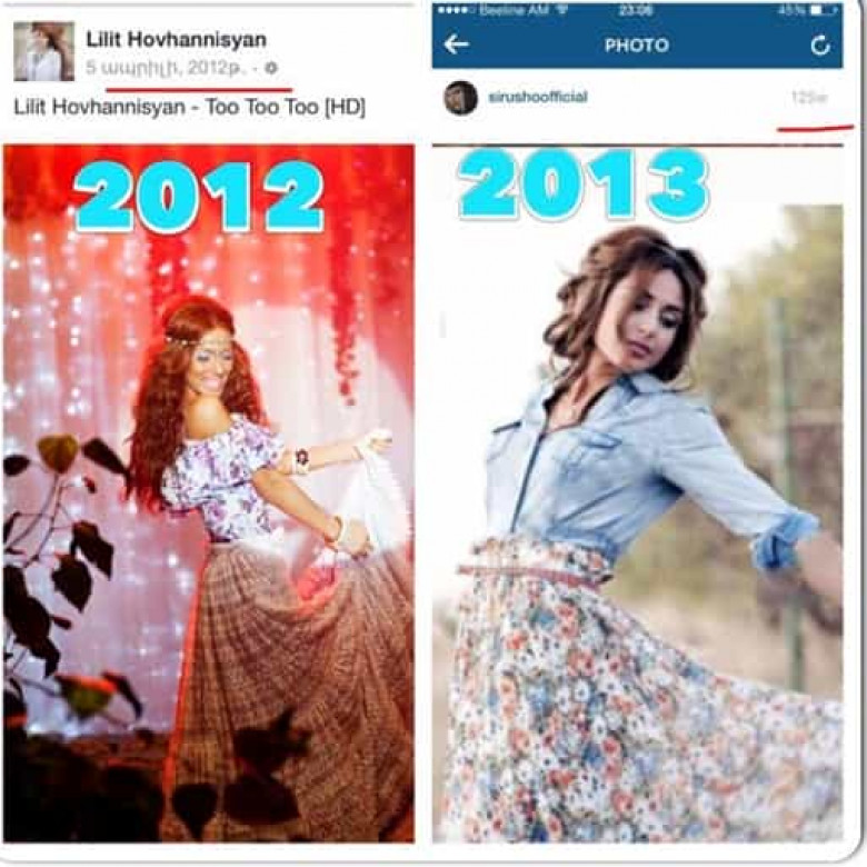4) Լիլիթ Հովհաննիսյանն առաջիններից էր, ով ի սկզբանե հայտարարում էր, որ իր զգեստների հեղինակը հենց ինքը` Լիլիթն է, իսկ Սիրուշոն բազմիցս նշում էր դիզայներների անուններ, ում հետ աշխատում էր։ Այժմ ականատեսն ենք դառնում Սիրուշոյի նմանատիպ ստատուսների, ինչպիսիք են. «Զգեստի իմ տարբերակը»……… “Making a new costume”….. «Վերարկուների իմ տարբերակը»…… «Երեկոյան զգեստի իմ մոտեցումը»…… և այլն