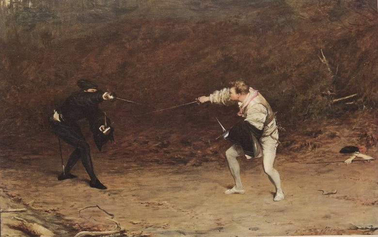 Հիմա՝ մի փոքր նախապատմություն: Գի դե Շաբո սինյոր Ժարնակը (1514-1584) ֆրանսիացի պալատական, զինվոր և նահանգապետ էր։ Ֆրանցիսկոս 1-ին թագավորի արքունիքում նրա անունը սկանդալի մեջ էր հայտնվել, նրան մեղադրել էին սեփական խորթ մոր հետ սիրային կապ ունենալու մեջ։ Իր համբավը վերականգնելու համար էլ Ժարնակը մարտահրավեր էր նետել այդ լուրերը տարածող մարդուն՝ սինյոր դը Լա Շատայնին, որը համարվում էր Ֆրանսիայի լավագույն սուսերամարտիկն ե րից մե կը։ Ժար նակն, իր հեր թ ի ն , առանձնապես հմուտ չէր սուսերամարտում։ 1547 թվականի հուլիսի 10-ին տեղի է ունեցել այդ հայտնի մենամարտը։ Մինչ դուելն սկսվելը, երկու մարտիկներն էլ Ավետարանի վրա երդվել են, որ կռվում են հանուն ճշմարտության, և որ նրանցից ոչ մեկը չի դիմել կախարդության։ Նրանք երկար ժամանակ փոխանակել են հարվածներ, սակայն ապարդյուն, ապա Ժարնակը շեղող շարժում է կատարել՝ ստիպելով մրցակցին ձեռքերը բարձրացնել, իսկ հետո արագ հարվածել է նրա ծնկին։ Թեև վերքն ինքնին լուրջ չէր, բայց Լա Շատենյեն կորցրել է հավասարակշռությունն ու ընկել: Ժարնակն անմիջապես պահանջել է, որ նա ընդունի պարտությունը և ներողություն խնդրի, սակայն հանդիսատեսը ցնցված է եղել անսպասելի արդյունքից։ Ինքը՝ Լա Շատենյեն, հրաժարվել է ընդունել պարտությունը՝ փորձելով վեր կենալ և շարունակել պայքարը։ Իհարկե, Ժարնակը կարող էր վերջ տալ իր հակառակորդին, բայց փոխարենը զինաթափել է նրան։ Արդյունքում արքան է միջամտել և դադարեցրել մենամարտը։