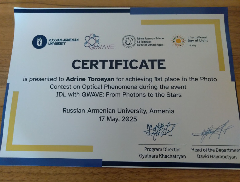 ԲԼՈԳԱդրինե Թորոսյանի հերթական 1-ին պատվավոր մրցանակը՝ այս անգամ էլ գիտական լուսանկարների մրցույթում. ֆիզիկայի փայլուն գիտելիքներս համադրվեցին լուսանկարչի, հեռուստառեժիսորի մասնագիտական կարողություններիս հետ: