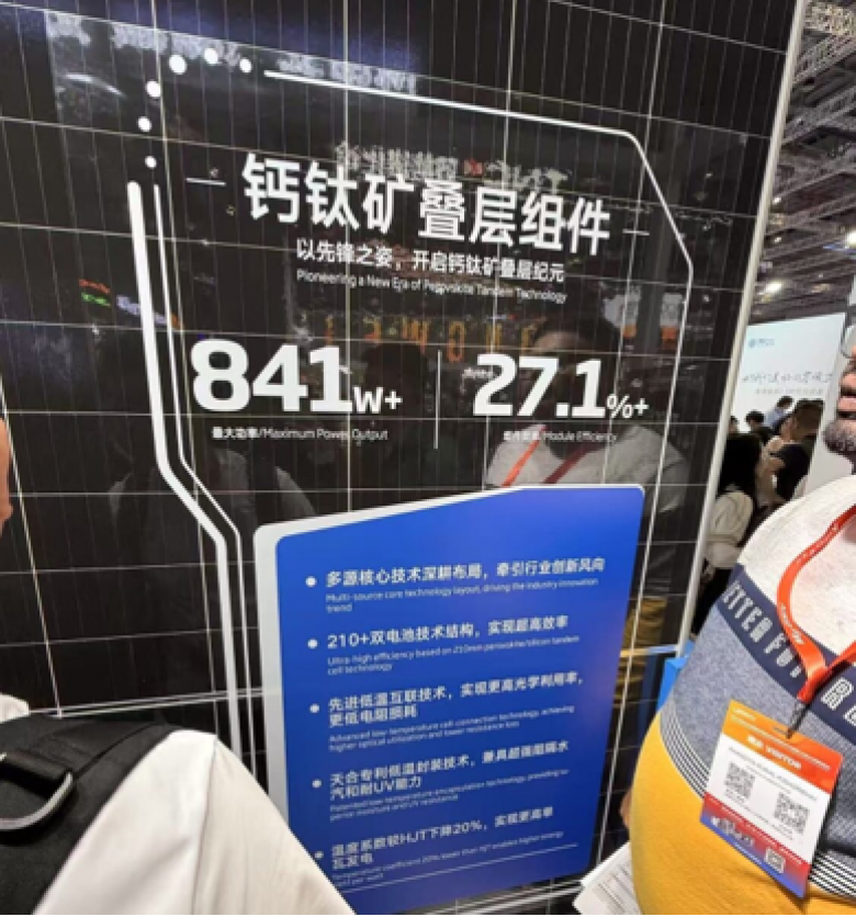 ՏՆՏԵՍՈՒԹՅՈՒՆՉինական Trina Solar ընկերությունը ներկայացրել է 841 Վտ հզորությամբ պերովսկիտ-սիլիցիումային տանդեմային արևային մոդուլի նախատիպը, գրում է prosolar.ru–ն։ Ընկերությունը Չինաստանի Շանհայում կայացած SNEC միջազգային ֆոտովոլտային և խելացի էներգիայի ցուցահանդեսում է ներկայացրել այդ նախատիպը։ Վահանակն ունի 27.1 % ընդհանուր մոդուլային արդյունավետություն և հիմնված է 210 մմ տանդեմային բջիջների վրա։ Trina-ն հայտարարել է, որ օգտագործել է ցածր ջերմաստիճանի միացման տեխնոլոգիա ավելի բարձր օպտիկական օգտագործման և ավելի ցածր դիմադրության կորուստների հասնելու համար։