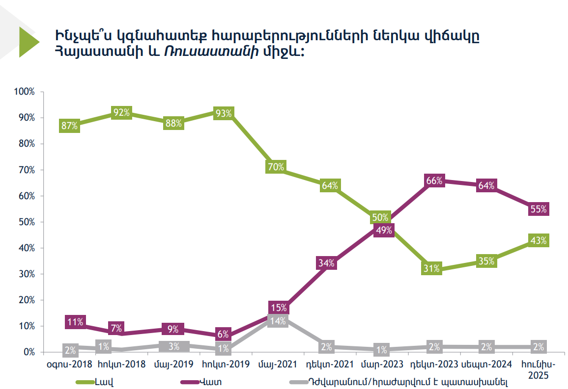 ՎԵՐԼՈՒԾԱԿԱՆԱմերիկյան միջազգային հանրապետական ինստիտուտի վերջին հարցումները չափազանց ուշագրավ մի տենդենց են արձանագրում։ Մասնավորապես, հարցերից մեկը վերաբերում էր Հայաստանի և Ռուսաստանի միջև հարաբերությունների ներկայիս վիճակին։ 2025 թվականի հունիսին հարցվածների 55 տոկոսը վատ է գնահատել հարաբերությունների ներկայիս վիճակը, դրական՝ միայն 43 տոկոսը։ Առաջին հայացքից այս զարգացումը կարող է տարօրինակ թվալ, բայց հաշվի առնելով նախորդ հարցումների հետ, չէ՛, բավականին ուշագրավ պատկեր ենք ստանում։