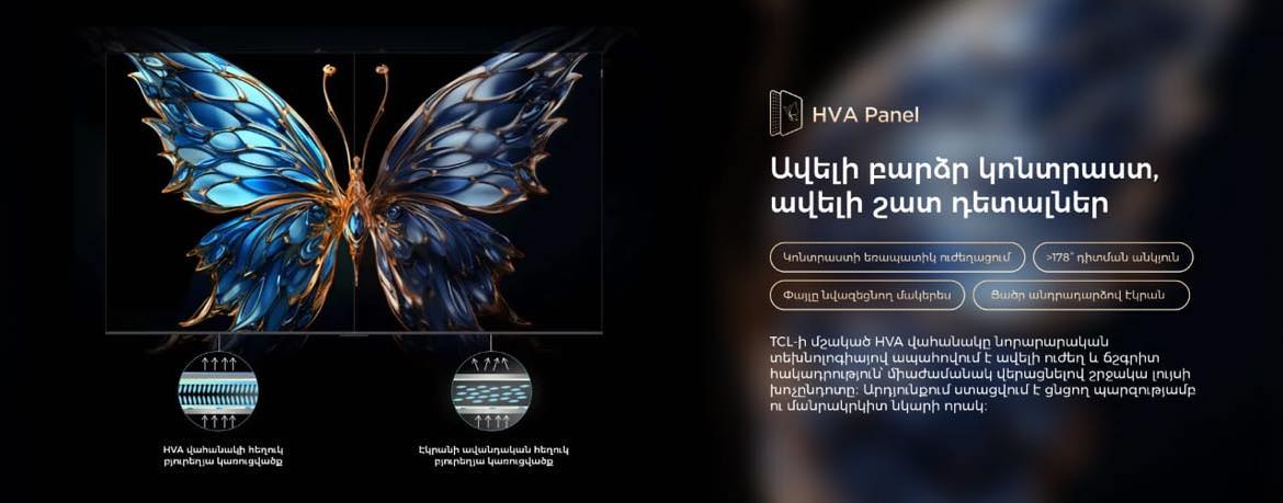 - Էկրաններ՝ LED, QLED, MiniLED՝ պայծառությամբ ու պատկերի խորությամբ